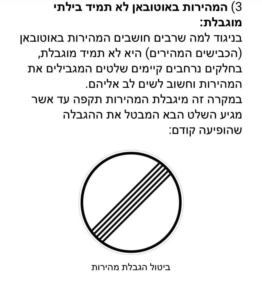לא בכל המקטעים ניתן לנסוע ללא הגבלת מהירות, אלה רק מתי שאתם רואים את התמרור העגול בצבעים שחור ולבן שחוצים אותו באמצע 5 קווים שחורים דקים (צירפתי תמונה נוספת).