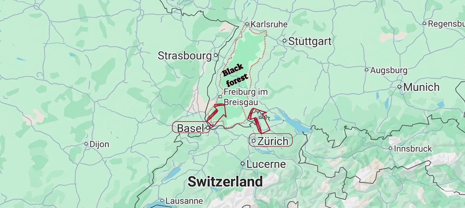 🌏 בכדי לעשות סדר בכיוונים, במפה הזו אפשר לראות ולהבין את המרחקים בין באזל וציריך לאזור היער השחור: